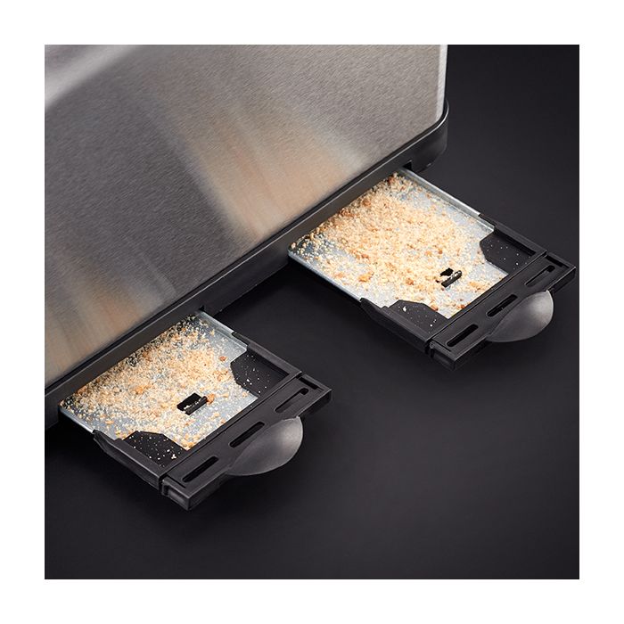 The indicator lights will also light up when the toaster has been switched on and operating. The toaster has a removable crumb tray which allows for easy cleaning and prevents hazardous build-up inside the toaster. The toaster also offers a unique function that automatically centres the bread slices inside the toaster ensuring an even browning.