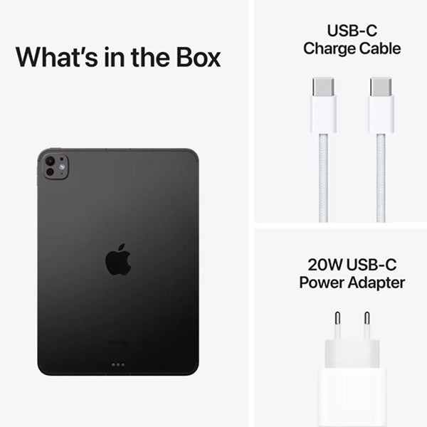 - Included Accessories: iPad Pro, USB-C Charge Cable, 20W USB-C Power Adapter